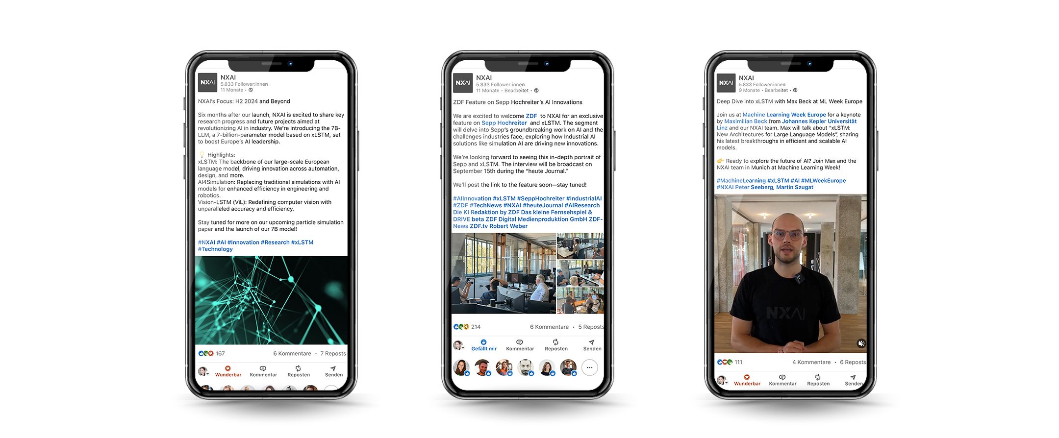 NXAI vernetzt führende Forschende mit Wirtschaft und Anwendung. Das Team kombiniert wissenschaftliche Exzellenz mit praxisnahen Lösungen und schafft internationale Sichtbarkeit für innovative KI-Entwicklungen. Dabei setzt NXAI von Beginn an auf eine starke LinkedIn-Präsenz, um internationale Sichtbarkeit und fachliche Vernetzung zu schaffen.