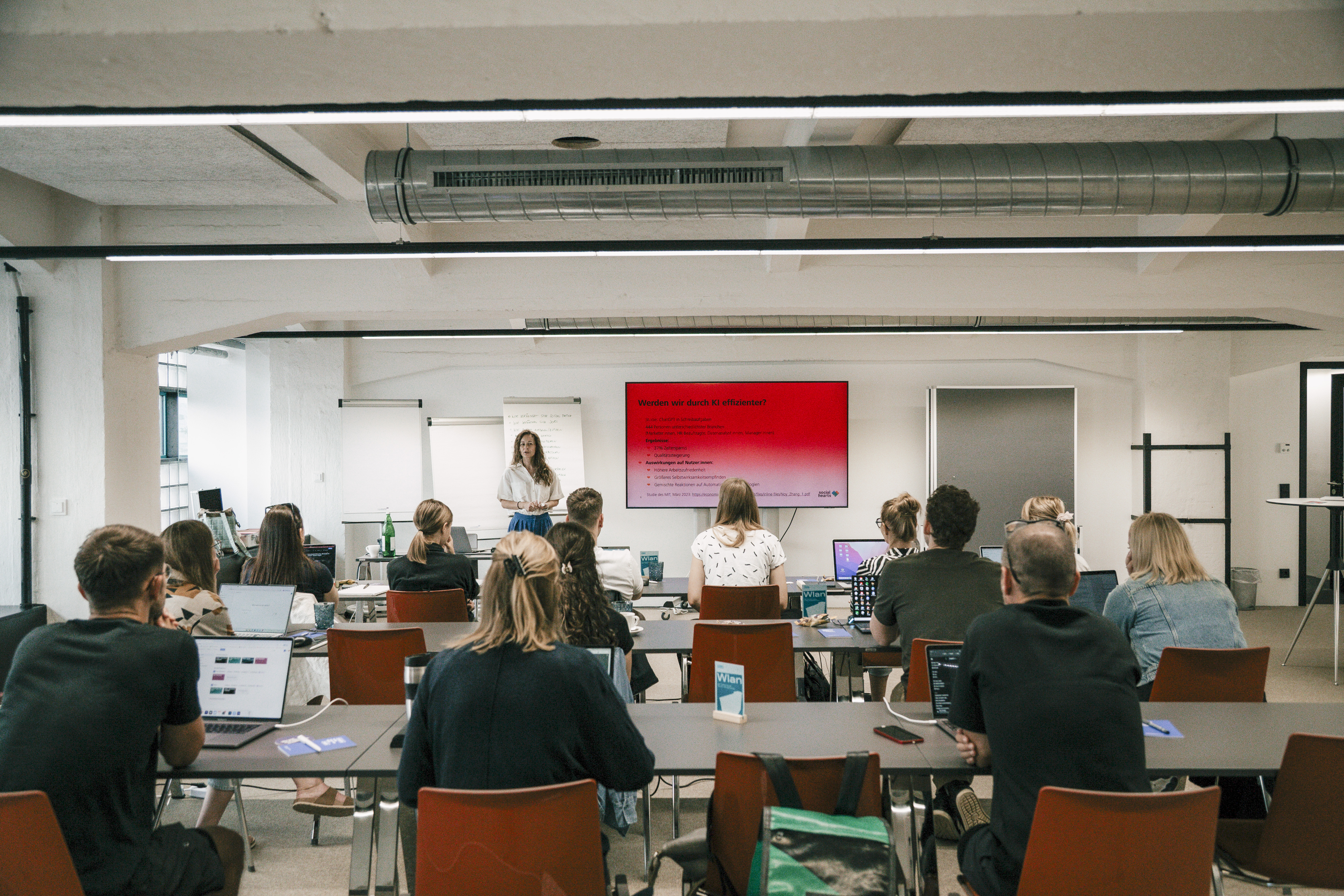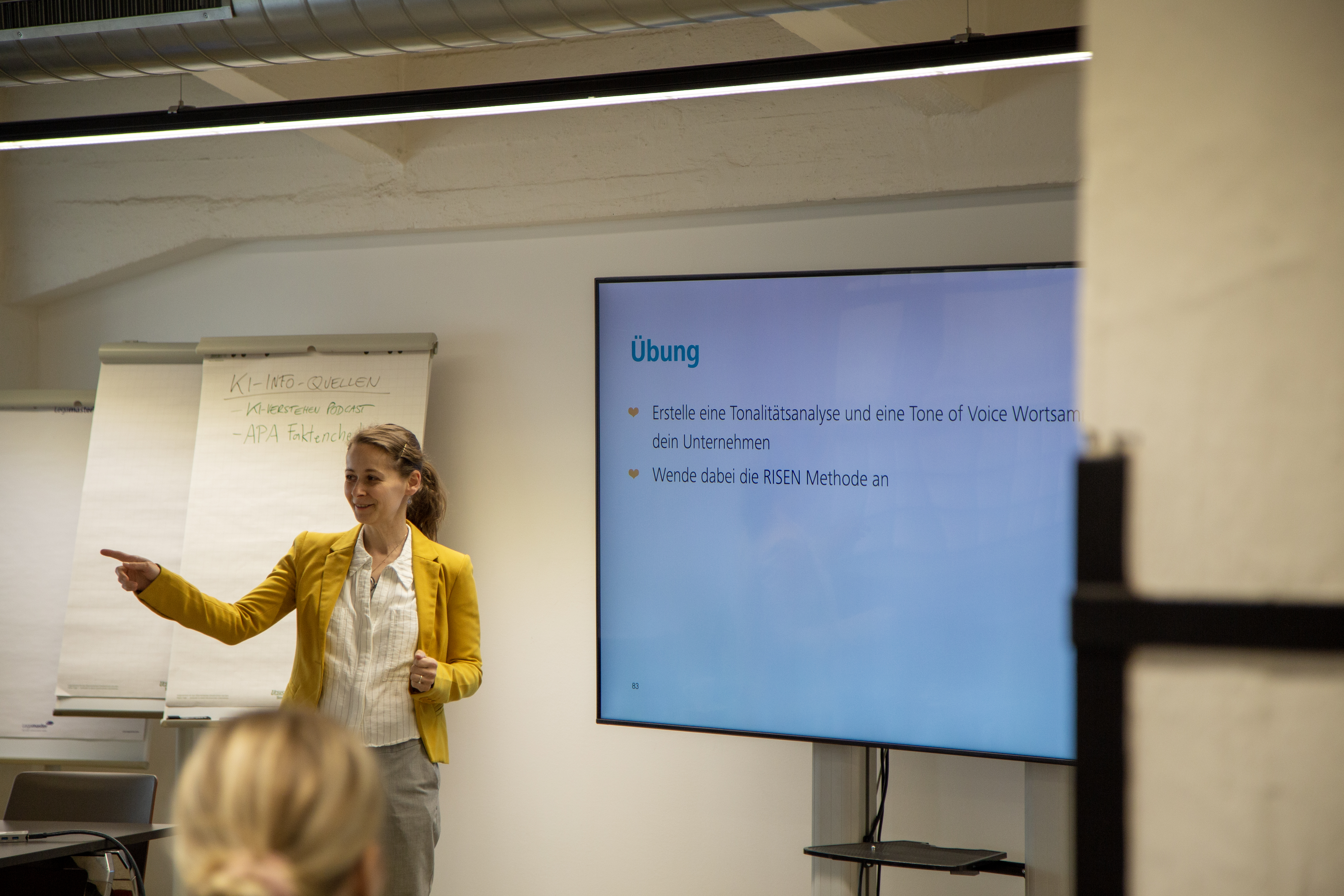 Die Teilnehmenden setzen KI im Workshop direkt ein: konzeptionelle Entwicklung, Textoptimierung, Übersetzung, Community Management, visuelle Inhalte via DALL·E, Präsentationen gestalten und Inhalte zusammenfassen – alles live und anwendbar.