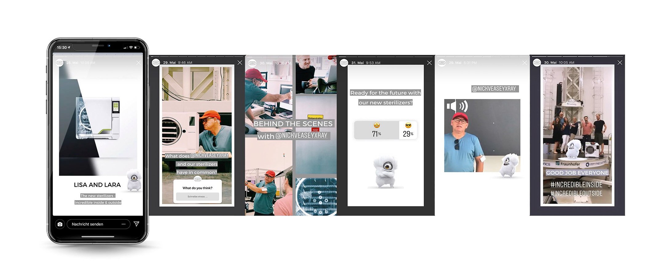 Ein weiterer wichtiger Aspekt im weltweiten Geschäft von W&H Dentalwerk sind Messeauftritte. Nachdem Social Media Verantwortliche nicht immer vor Ort sein können, war es wichtig deren internationale Kolleg:innen zu schulen. In einem Workshop gaben wir den Mitarbeiter:innen das Werkzeug in die Hand, dass sie für gutes Storytelling für Live-Content mittels Instagram Stories benötigen.